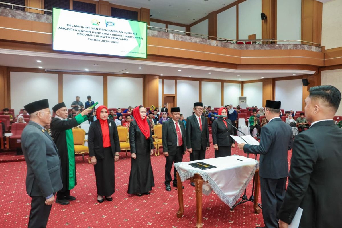 KENDARI, SULTRAINFORMASI.ID – Gubernur Sulawesi Tenggara (Sultra), Mayjen TNI (Purn) Andi Sumangerukka (ASR) resmi melantik pengurus Badan Pengawas Rumah Sakit (BPRS) Provinsi Sultra masa bakti 2025–2027. Acara pelantikan yang dirangkaikan dengan pengambilan sumpah jabatan ini digelar di Ruang Pola Kantor Gubernur Sultra, Kamis (04/09/2025).