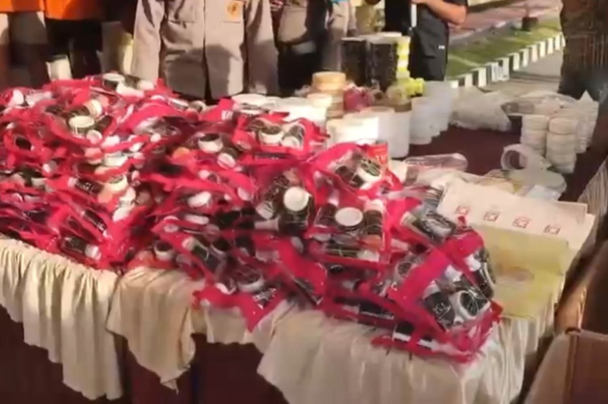 Barang bukti yang diamankan di antaranya 35 pot hand body ukuran 250 ml, 25 pot ukuran 500 ml, 30 pot ukuran 100 ml, 2 pot ukuran 1000 ml, 13 paket skincare merek Tabita, serta 25 stiker bertuliskan “DF Beauty by Dewi”.