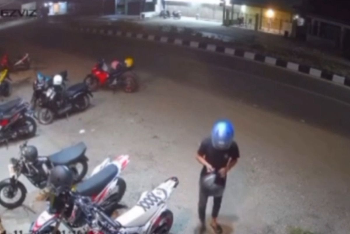 Dalam rekaman video yang diterima Sultrainformasi.id, pelaku terlihat mengenakan baju hitam, helm biru merek KYT, dan masker. Ia tampak santai duduk di atas sepeda motornya sambil memantau situasi sekitar.