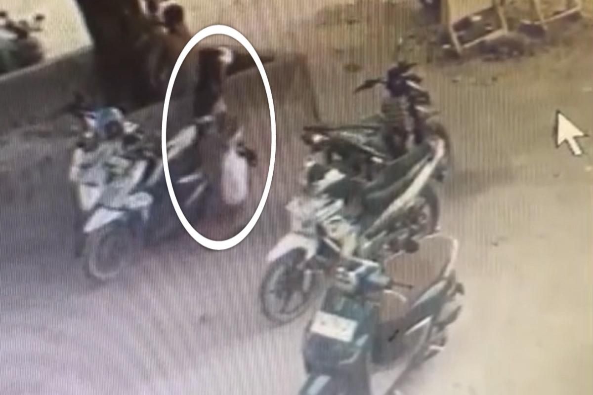 Beberapa detik kemudian, perhatian pelaku beralih ke motor lain yang terparkir di belakangnya. Di atas motor itu tergantung sebuah kantung plastik putih berukuran cukup besar. Pelaku terlihat sangat tenang, memerhatikan sekitar untuk memastikan aksinya tidak diketahui orang lain.