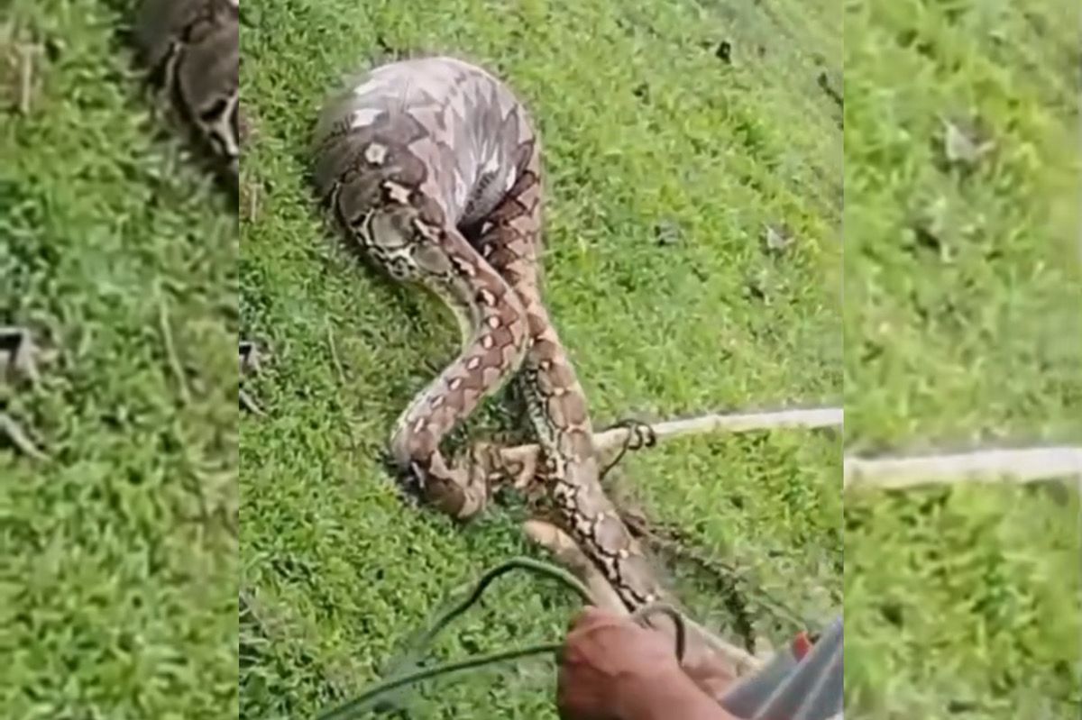 Dalam video amatir berdurasi beberapa detik yang beredar, terlihat seorang warga berusaha menarik ekor ular tersebut. Reptil yang dikenal sebagai sanca itu tak mampu bergerak cepat karena perutnya membesar setelah menelan habis anak sapi milik warga.