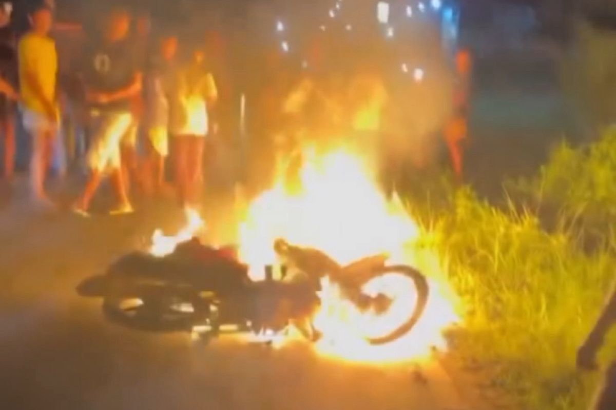 ‎Tak puas, motor yang sudah hancur tersebut kemudian disiram bahan bakar dan tak lama, kobaran api besar langsung melahapnya di tengah jalan.