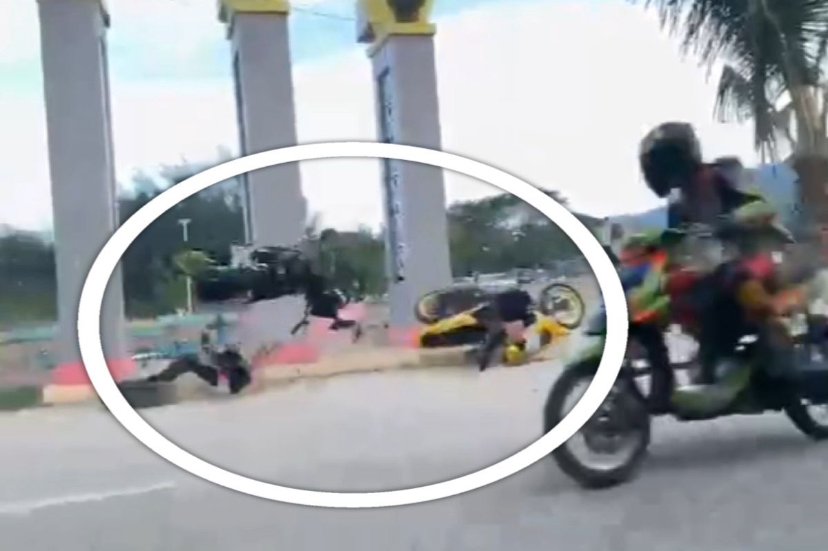 Dimana dua raider mengalami kecelakaan hebat hingga salah satunya menabrak gapura di pinggir lintasan.
