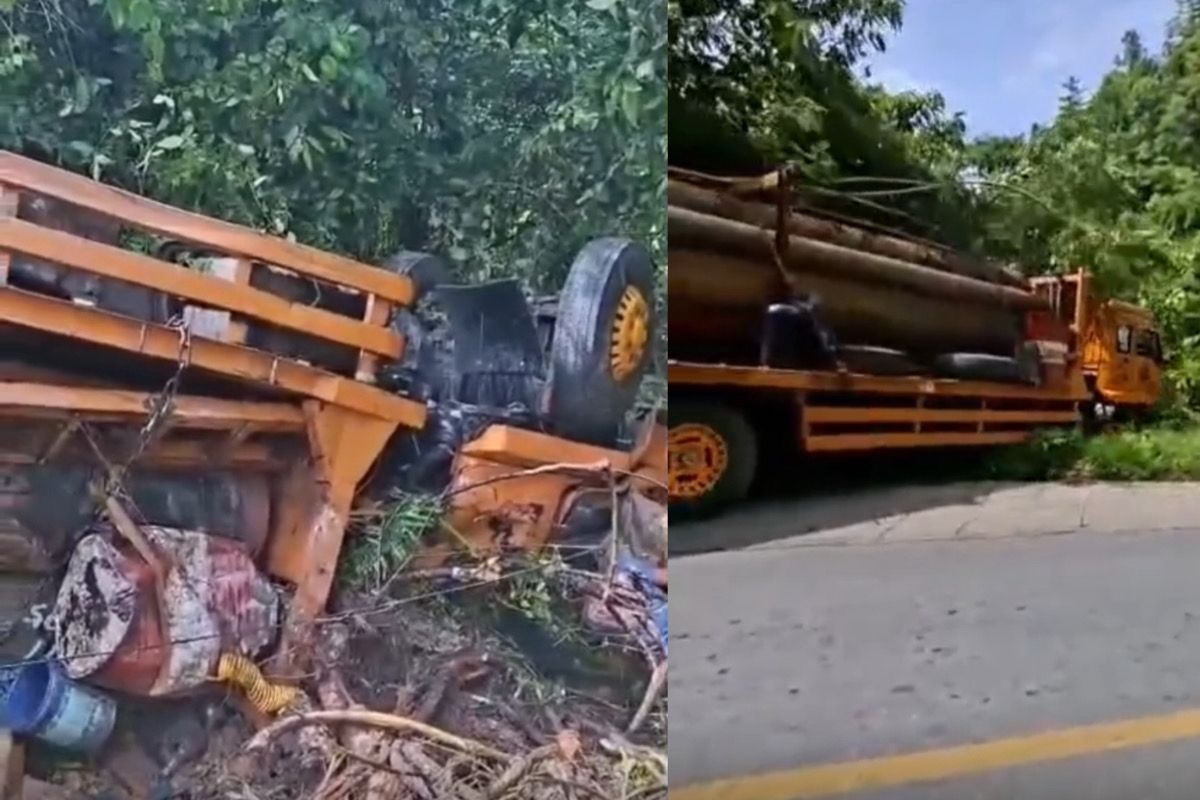 Dimana sebuah mobil truk Hino berwarna oranye dengan nomor polisi DC 8452 DC yang mengangkut pipa besi terjun ke jurang usai mengalami rem blong di jalan turunan.