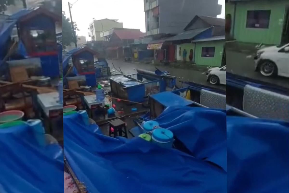 “Hancur warung makan di Pasar Wameo, hancur, angin dengan badai-badainya ta buang semua,” kata pria dalam video itu.
